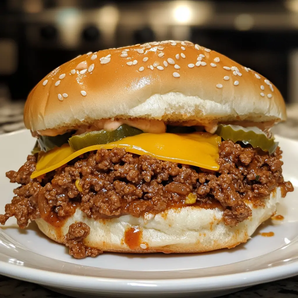 Assemble the Sloppy Joes by placing a slice of cheddar cheese on the bottom half of each toasted bun. Spoon a generous amount of the Sloppy Joe mixture over the cheese, followed by another slice of cheddar cheese. Top with shredded lettuce and dill pickle slices, then drizzle with the special sauce. Finally, place the top half of the bun on each sandwich.
