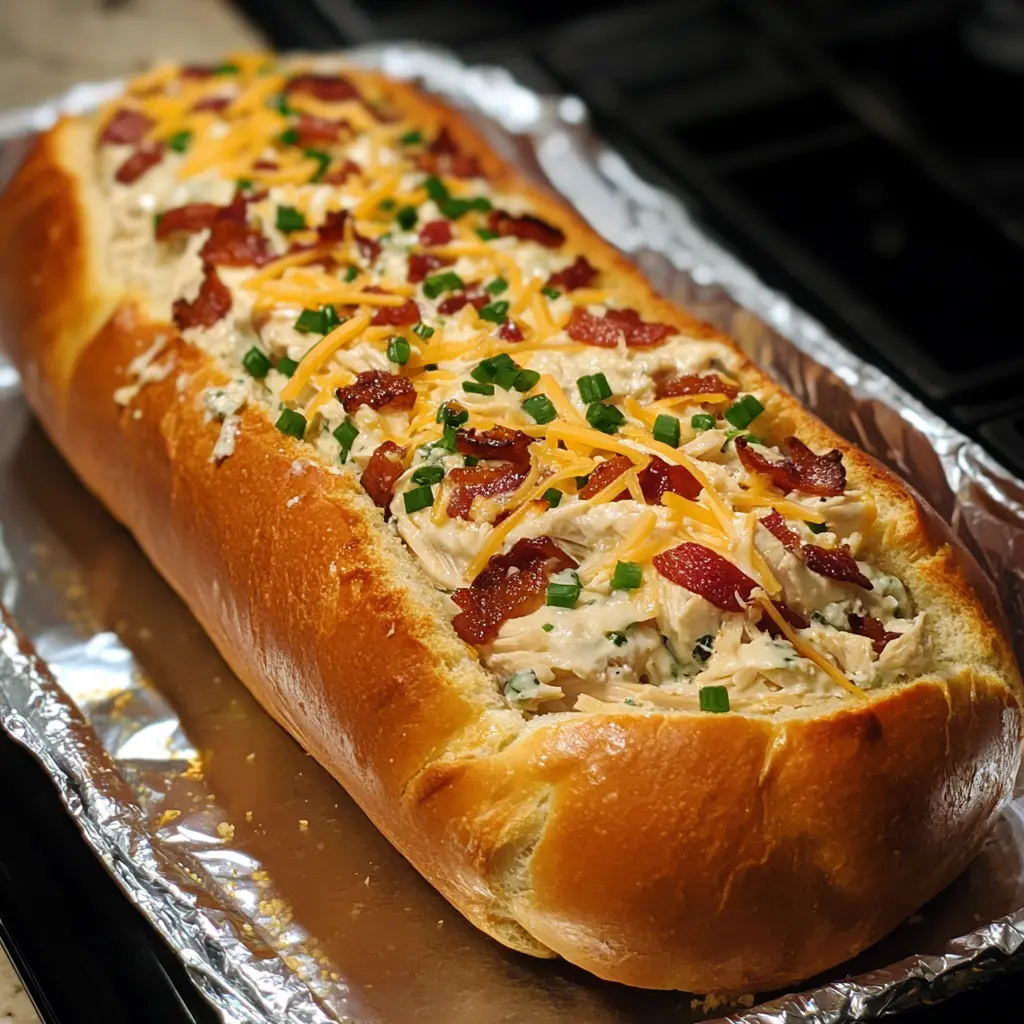 Indulge in the ultimate comfort food with this Chicken Bacon Ranch Stuffed Bread. This savory Italian bread is generously filled with creamy chive and onion cream cheese, tender rotisserie chicken, crispy bacon, and a delightful blend of Ranch dressing and cheese. Perfect for parties, game days, or a cozy family dinner, this dish combines all your favorite flavors into one delicious loaf.