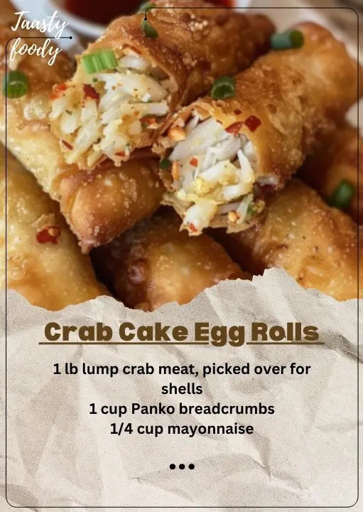 – 1 lb lump crab meat, picked over for shells – 1 cup Panko breadcrumbs – 1/4 cup mayonnaise – 1 large egg, lightly beaten – 2 tablespoons Dijon mustard – 2 green onions, thinly sliced – 1 tablespoon Old Bay seasoning – Salt and black pepper to taste – 12 egg roll wrappers – Vegetable oil, for frying – Sweet chili sauce or tartar sauce, for serving
