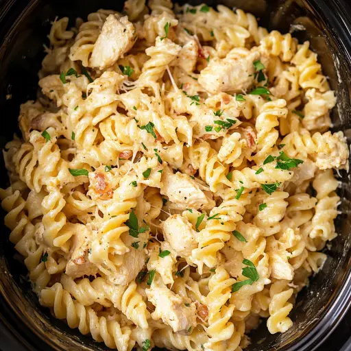 A5: Allow the Crockpot Garlic Parmesan Chicken Pasta to cool completely before storing it in an airtight container in the refrigerator. Leftovers will keep for up to 3-4 days. To reheat, microwave in 1-minute intervals, stirring in between, or heat in a skillet over medium heat until warmed through. You may need to add a splash of milk or broth to add some moisture.
