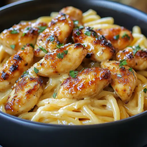 Add the cooked pasta to the skillet and toss until well coated with the creamy Parmesan sauce. Ensure that every strand of pasta is glistening with the sauce. The sauce should be thick enough to cling to the pasta without being too heavy. Top with the garlic butter chicken bites, arranging them attractively over the pasta. Garnish with fresh parsley and extra Parmesan cheese, if desired. Fresh parsley adds a pop of color and freshness to the dish. Serve immediately and enjoy the harmonious blend of flavors and textures.
