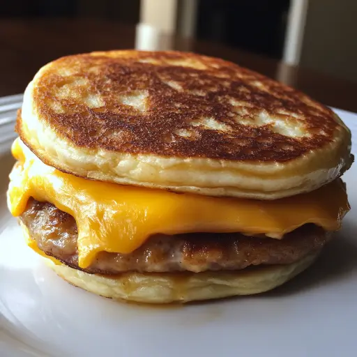 Description A delightful homemade version of the classic McGriddle, featuring fluffy maple-infused pancakes, savory Halal sausage, and melted cheese, perfect for a satisfying breakfast or brunch.