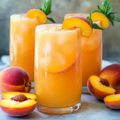 Description: This Peach Lemonade recipe is the perfect summer refreshment. Blending sweet, juicy peaches with tangy lemonade creates a vibrant and flavorful drink that’s both incredibly easy to make and delightfully thirst-quenching. The addition of fresh mint elevates the flavor profile, adding a cool, aromatic note that complements the sweetness of the peaches perfectly. Whether you’re hosting a backyard barbecue, relaxing by the pool, or simply want a delicious way to beat the heat, this Peach Lemonade is sure to become a new favorite. It’s a simple yet elegant twist on a classic summer beverage.