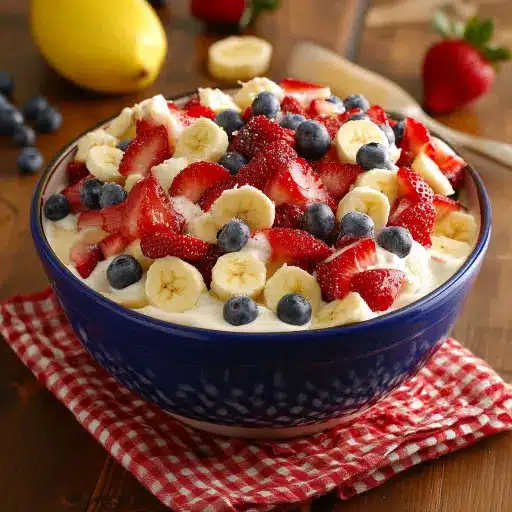 Description: A festive and delicious no-bake dessert perfect for summer holidays, potlucks, or any occasion that calls for a refreshing and colorful treat. This Red, White, and Blue Cheesecake Salad combines the creamy richness of cheesecake with the natural sweetness of fresh berries and bananas, all tossed in a light and tangy dressing. It’s easy to make, visually stunning, and a guaranteed crowd-pleaser.