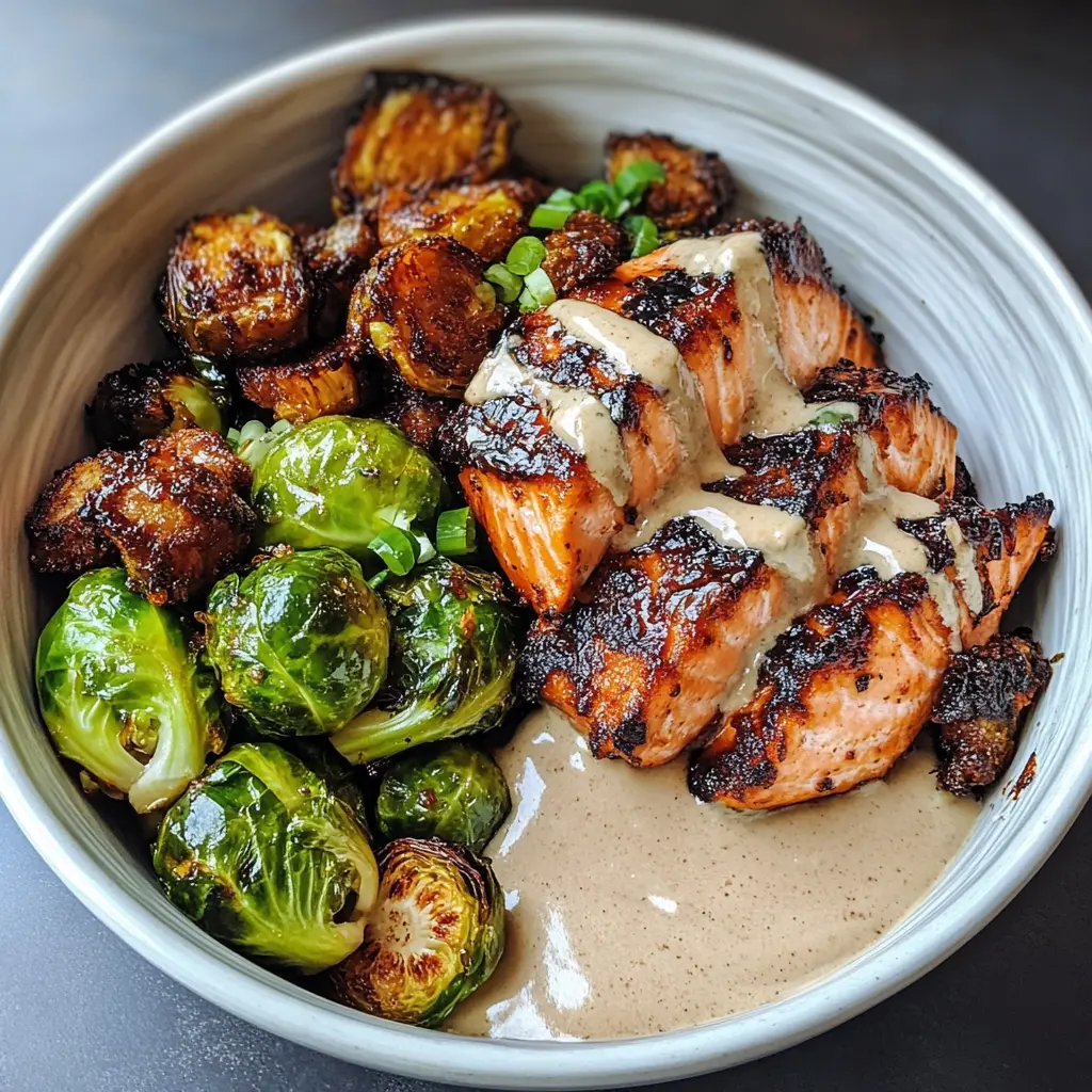 This recipe is a fantastic choice for anyone looking to enjoy a delicious yet healthy meal. The sweet and savory teriyaki marinade elevates the salmon, while the crispy Brussels sprouts add a delightful texture. The creamy sauce ties everything together, offering a zesty kick that complements the dish beautifully. Whether you’re a busy professional, a health-conscious eater, or simply someone who loves good food, these Teriyaki Salmon Bowls will quickly become a favorite in your kitchen.