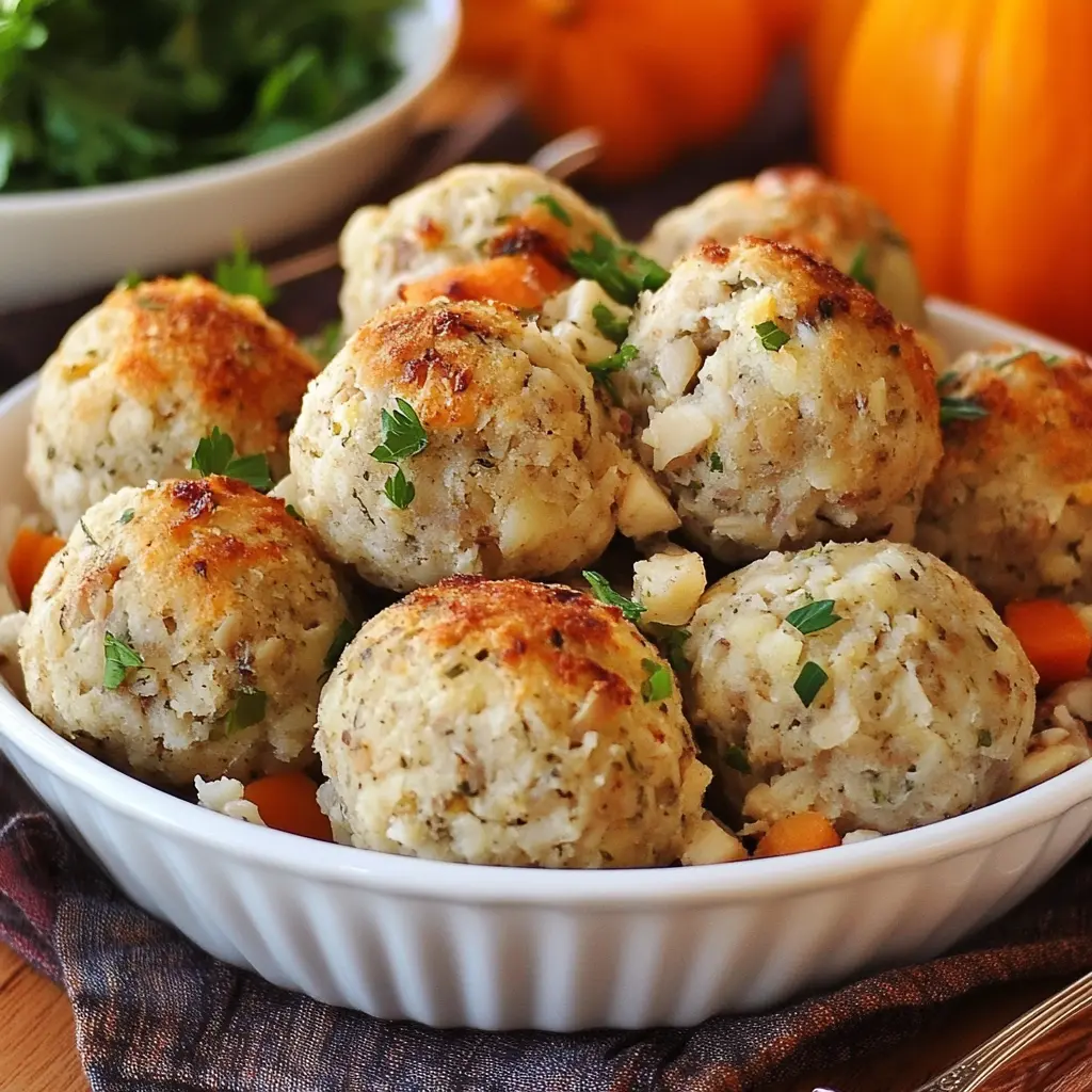 Serve the Turkey Stuffing Balls on a large platter garnished with fresh parsley or herbs for a pop of color. You can also pair them with a tasty dipping sauce, like cranberry sauce or a savory gravy, to enhance their flavor profile.