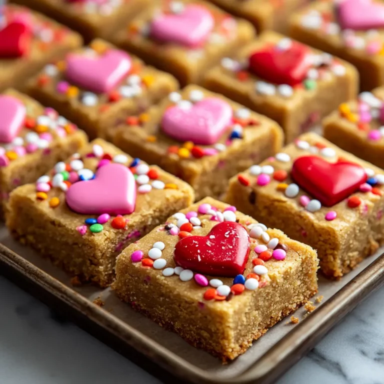 These delightful Valentine Peanut Butter Cookie Bars are the perfect treat to celebrate love and affection! With their soft, chewy texture and rich flavors, these bars are studded with colorful sprinkles and topped with adorable chocolate peanut butter hearts, making them an irresistible dessert that’s perfect for sharing with your loved ones. Whether it’s for a special occasion like Valentine’s Day or simply to show someone you care, these cookie bars are sure to bring smiles all around.