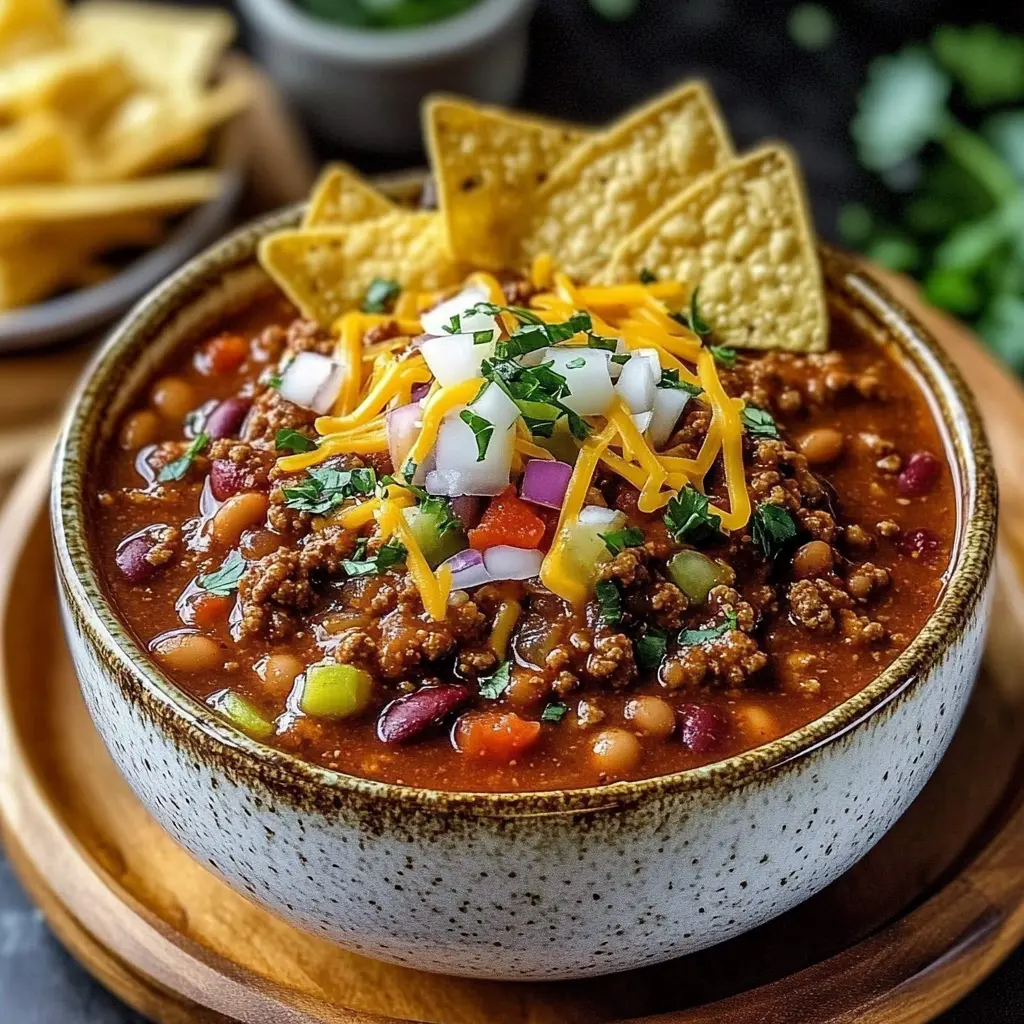 Serve this chili hot, garnished with shredded cheese, chopped green onions, or a dollop of sour cream for added richness. Pair it with cornbread or tortilla chips for a complete meal. This dish also makes for a great topping for baked potatoes or nachos.